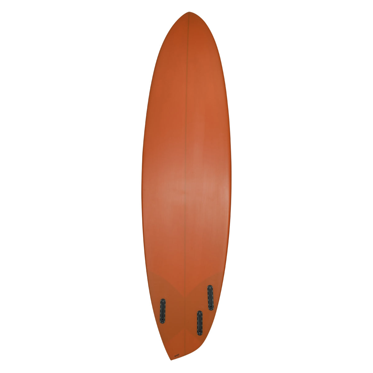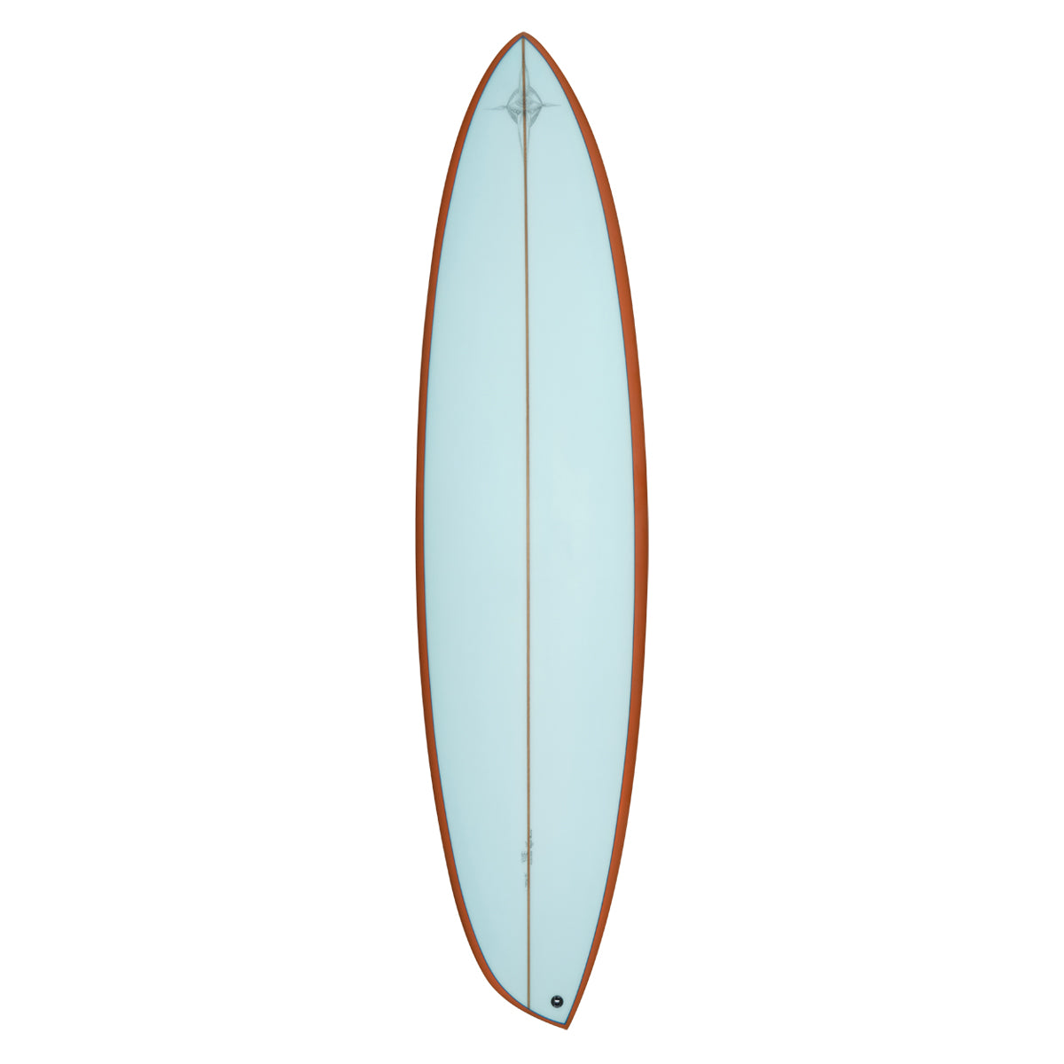The beluga is a spin off the reggae shark template with a high contrast bottom shape. It has a pronounced rolled entry that transitions mid board into a scooped out single concave which makes the front of the board smooth and nimble while still getting the fast planing responsive feel from the tail. The way the two bottom contours blend together is where the magic lies in the beluga, drawing curve between the feet in the rail rocker and making it turn on a dime despite size and thickness. Originally made for larger surf as a lazy board loaded with paddle power I was blown away by how fun it surfed in small pockety beach breaks and average surf. A sort of out there 2’-10’ ride-all machine. 0riginal dims are 6’9”x 20” x 3 3/8” and is made with the 1+2, twin toe, heel quad, fin set up.