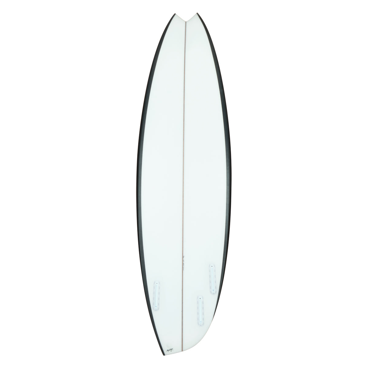A high-performance asymmetrical design much like the pickle fork twin but with slightly more radical asymmetry and a smoother release off the tail. Typically built with future removable fins, one on the toe side using my high aspect twin fin template and two of my cutaway quad fins on the heel side. The tail is great for tight in-the-pocket turns and the toe side rail provides drive and speed.