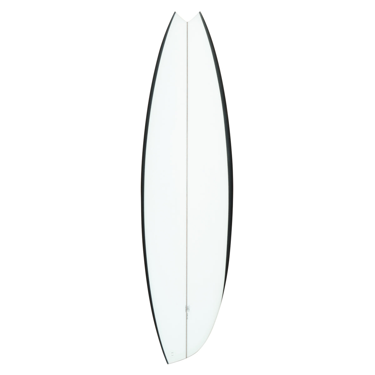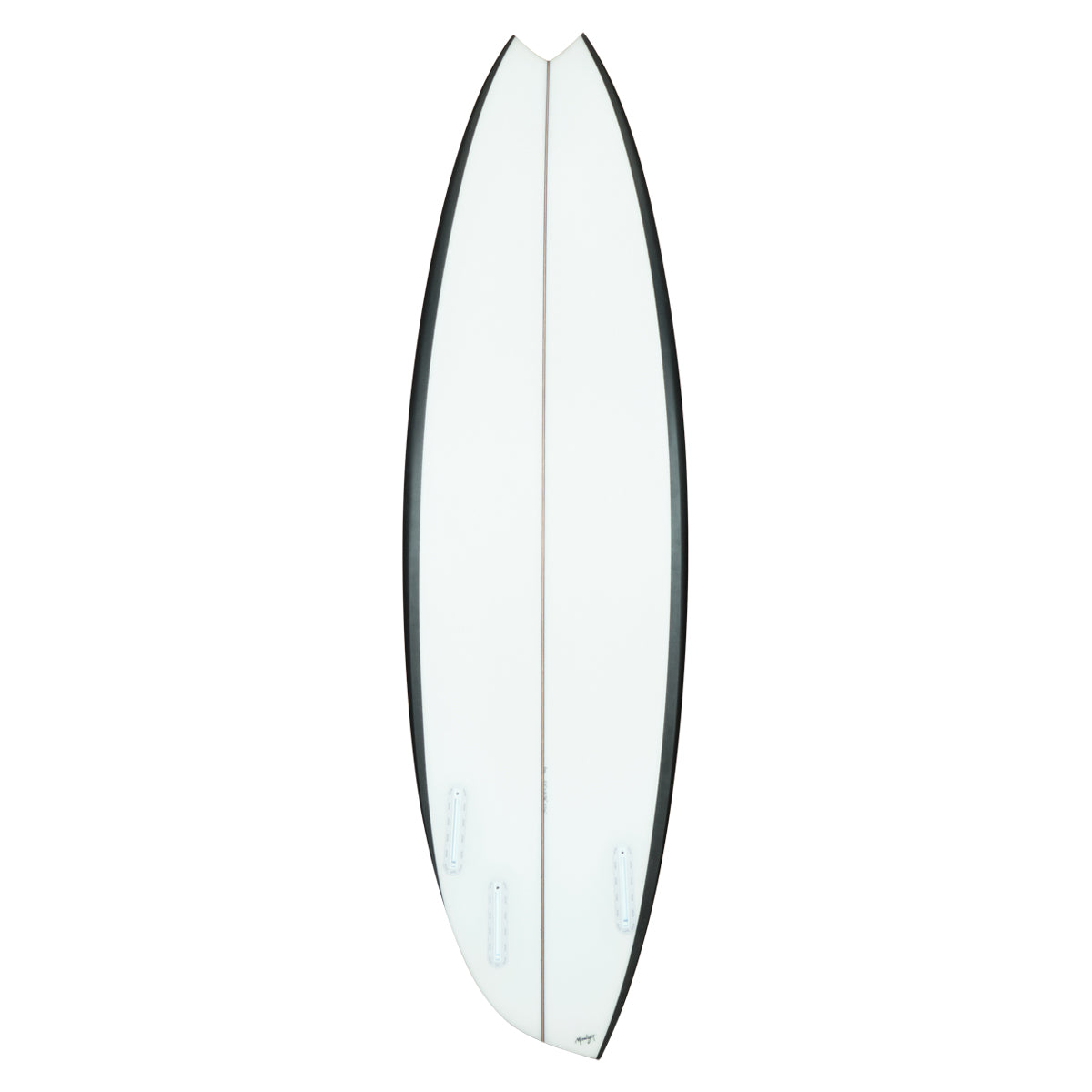A high-performance asymmetrical design much like the pickle fork twin but with slightly more radical asymmetry and a smoother release off the tail. Typically built with future removable fins, one on the toe side using my high aspect twin fin template and two of my cutaway quad fins on the heel side. The tail is great for tight in-the-pocket turns and the toe side rail provides drive and speed.
