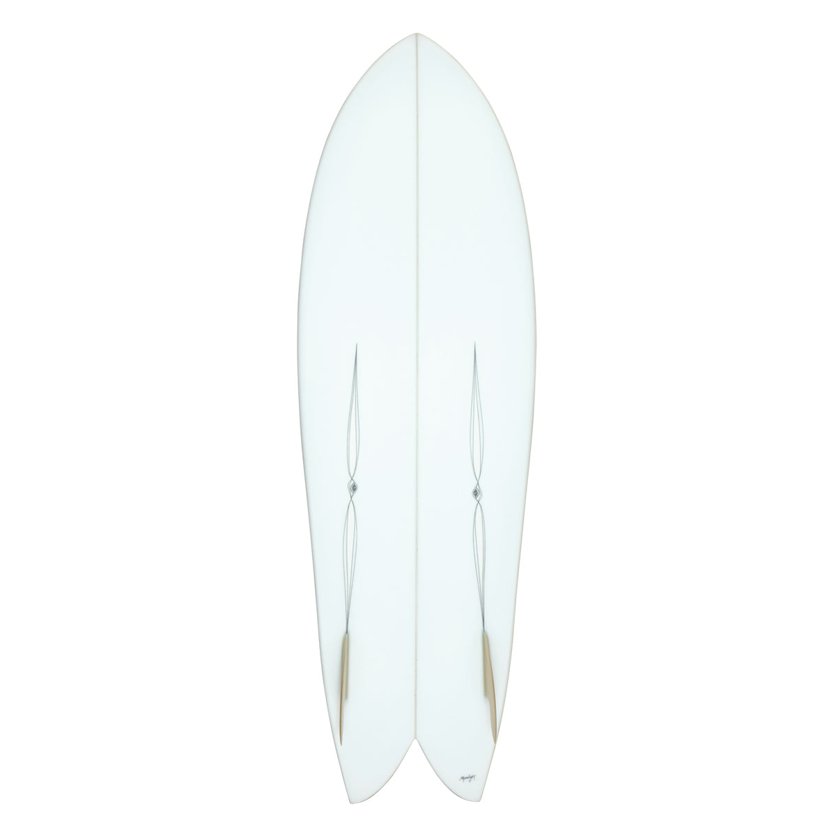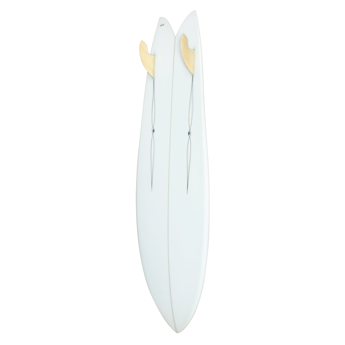 A slightly longer version of the Squit fish . My original slim squit was 6’3”, a whole foot longer than my usual Squit. The slim squit has blended crown instead of a flat deck with a banded rail. With the crowned deck the rails end up thinner and the beak more foiled. The outline on this one has a more pronounced side cut and a softer rail through the middle/ front of the board. The combo of that soft rail and cambered outline make this board hold a rail at high speed and turn tight off the tail.