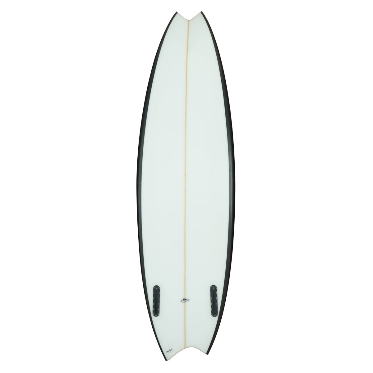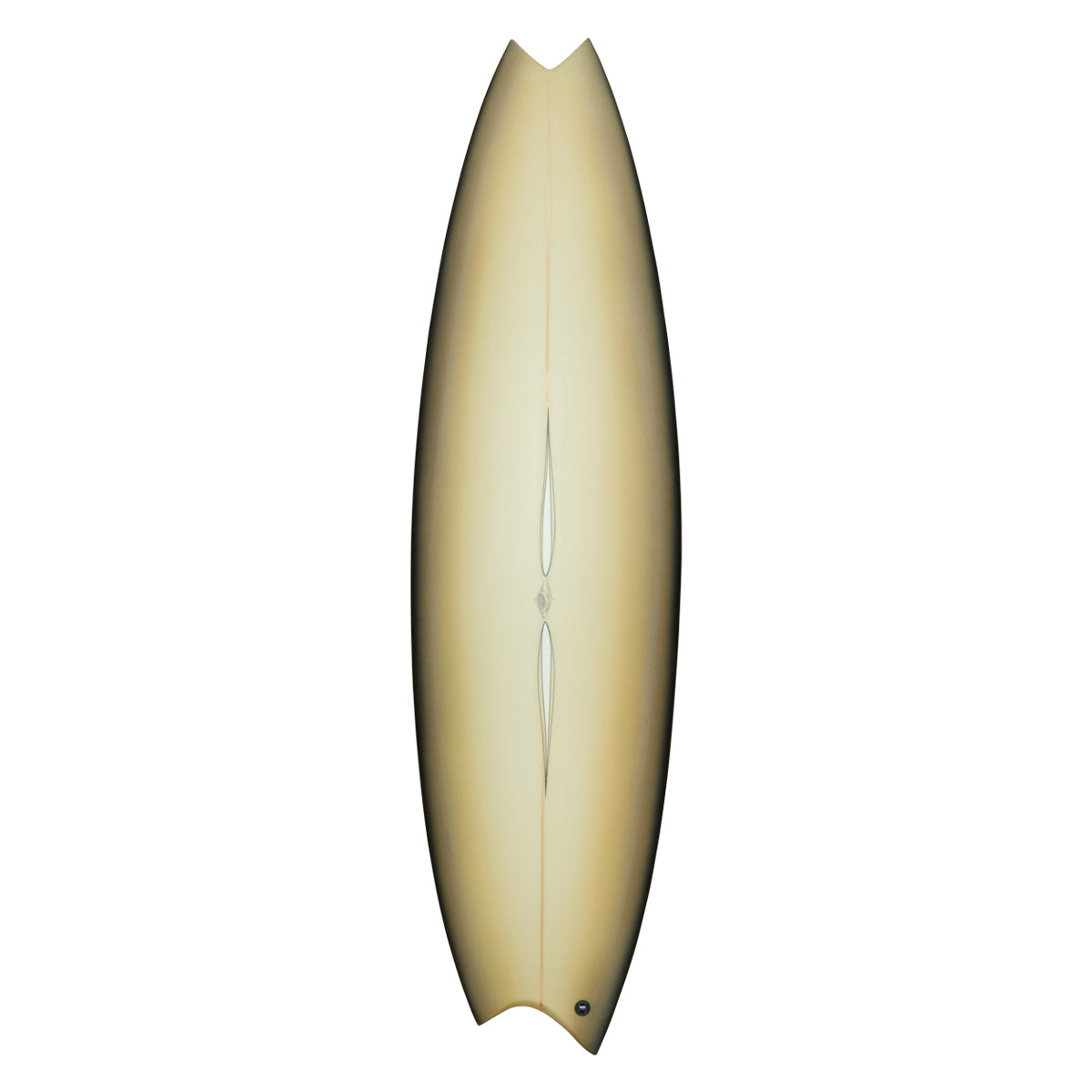 The Pickle Fork Twin (Aka Pickled Twin) is the most high-performance board I make. It features an asymmetrical outline with two points in the tail and two points in the nose. It has relatively balanced nose and tail widths and deep single concave running rail to rail throughout the board, deepest before the fins. The nose features an angular plane concave that runs about a foot down from the twin tips. This helps break the flow of water that would otherwise suction to the area of the accelerated curve in the nose. Having the width run throughout the nose adds functional surface area and creates a rail line of a much longer board. The tail is an asymmetrical swallow-tail with slightly offset high-aspect twin fins.