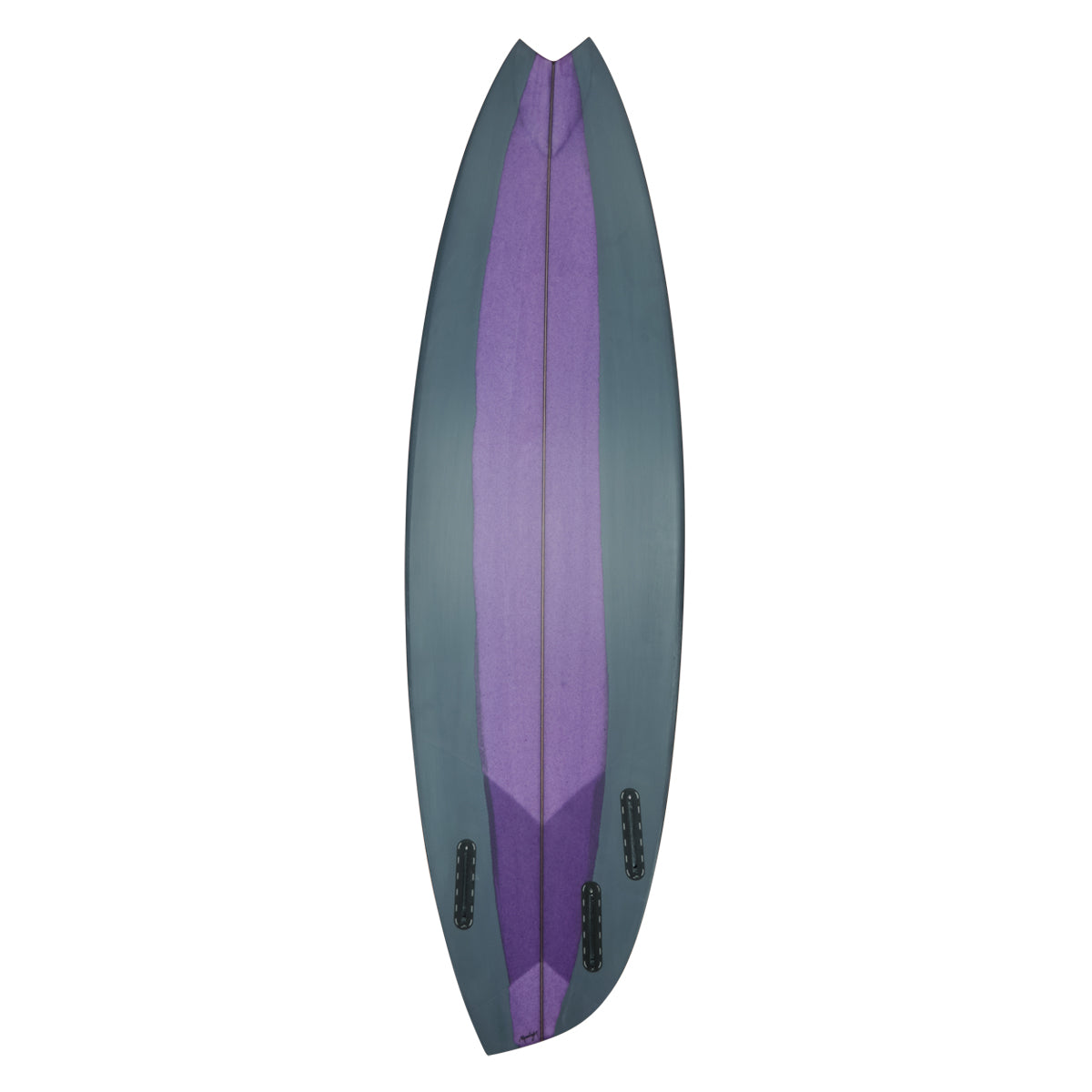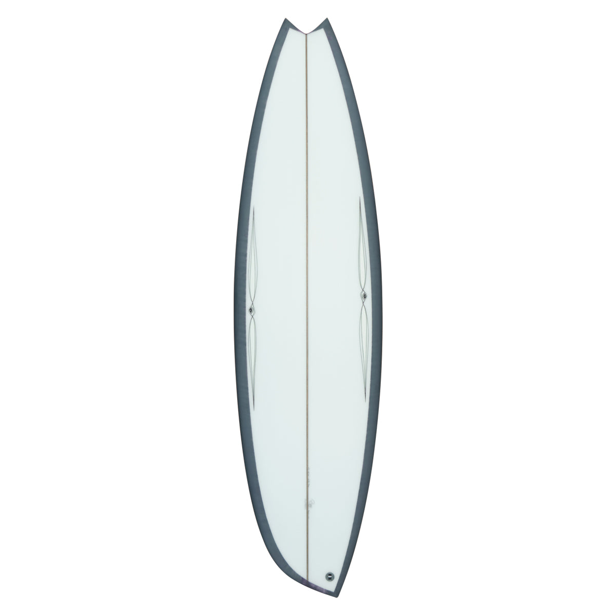 A high-performance asymmetrical design much like the pickle fork twin but with slightly more radical asymmetry and a smoother release off the tail. Typically built with future removable fins, one on the toe side using my high aspect twin fin template and two of my cutaway quad fins on the heel side. The tail is great for tight in-the-pocket turns and the toe side rail provides drive and speed.