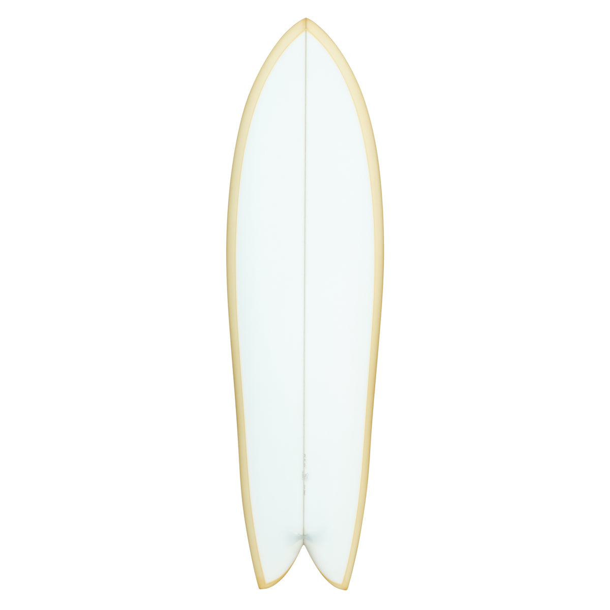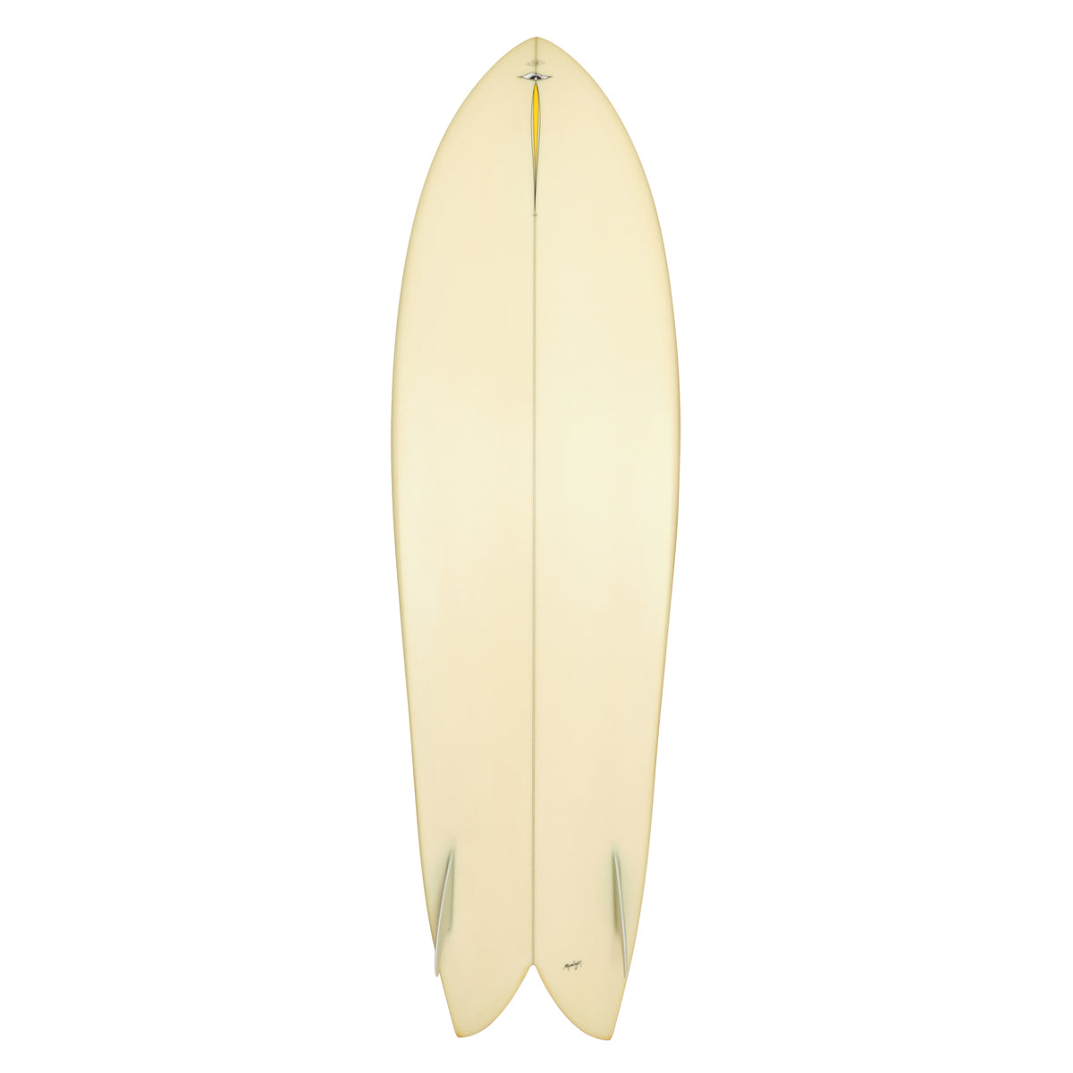 A slightly longer version of the Squit fish . My original slim squit was 6’3”, a whole foot longer than my usual Squit. The slim squit has blended crown instead of a flat deck with a banded rail. With the crowned deck the rails end up thinner and the beak more foiled. The outline on this one has a more pronounced side cut and a softer rail through the middle/ front of the board. The combo of that soft rail and cambered outline make this board hold a rail at high speed and turn tight off the tail.
