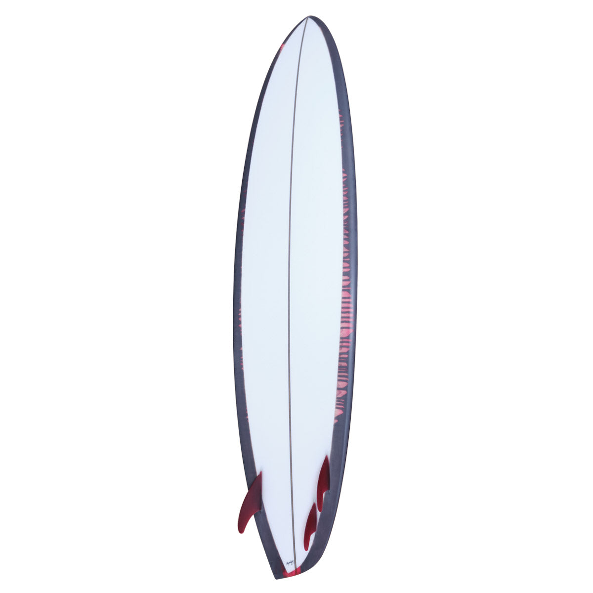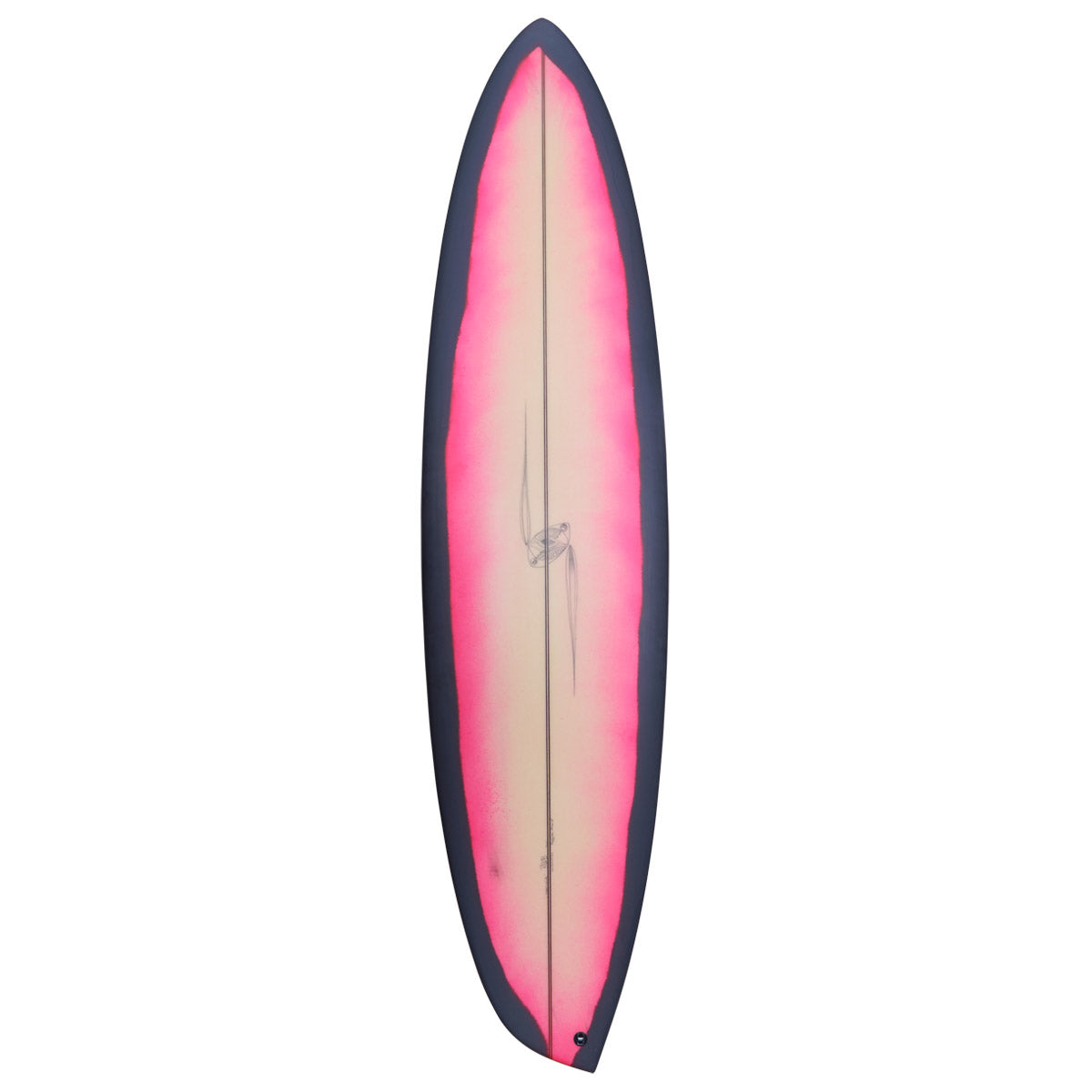 An asymmetrical mid length board with a fuller nose outline and curve throughout. The tail shape is rounded on the shorter heel side and curves to an off set point on the topside rail. Typically made with a bit of volume and a relaxed rocker for good paddling and stability. It can surf like a much shorter board with drive and sensitivity and a tight turning heel side.