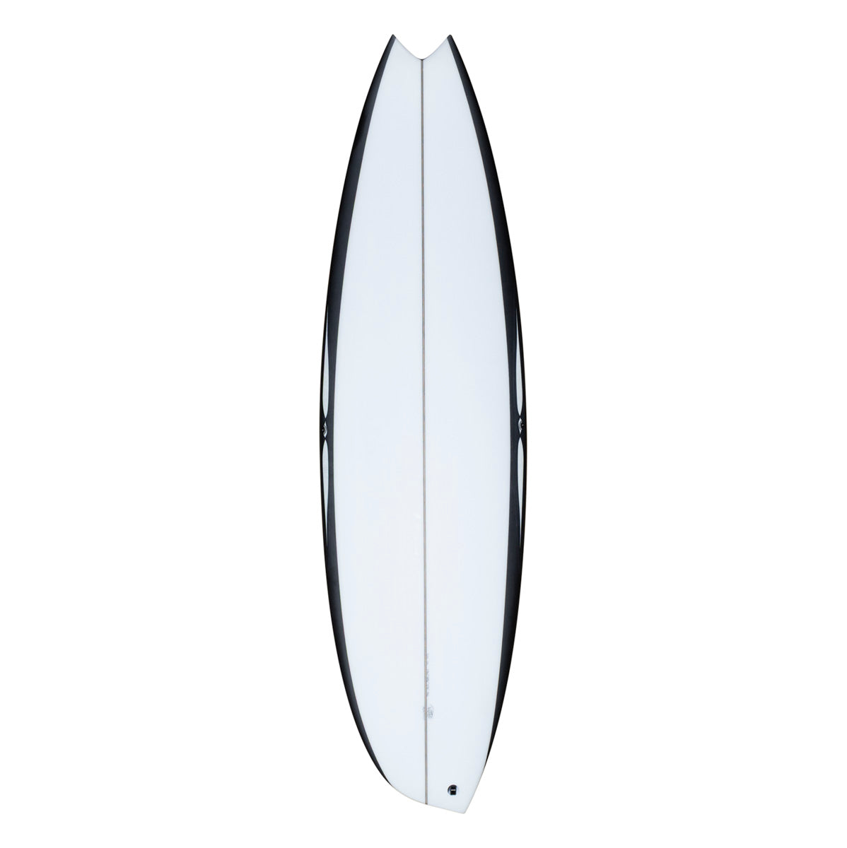 A high-performance asymmetrical design much like the pickle fork twin but with slightly more radical asymmetry and a smoother release off the tail. Typically built with future removable fins, one on the toe side using my high aspect twin fin template and two of my cutaway quad fins on the heel side. The tail is great for tight in-the-pocket turns and the toe side rail provides drive and speed.
