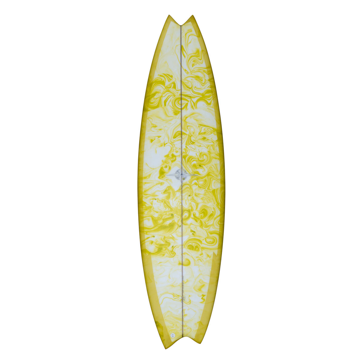 The Pickle Fork Twin (Aka Pickled Twin) is the most high-performance board I make. It features an asymmetrical outline with two points in the tail and two points in the nose. It has relatively balanced nose and tail widths and deep single concave running rail to rail throughout the board, deepest before the fins. The nose features an angular plane concave that runs about a foot down from the twin tips. This helps break the flow of water that would otherwise suction to the area of the accelerated curve in the nose. Having the width run throughout the nose adds functional surface area and creates a rail line of a much longer board. The tail is an asymmetrical swallow-tail with slightly offset high-aspect twin fins.