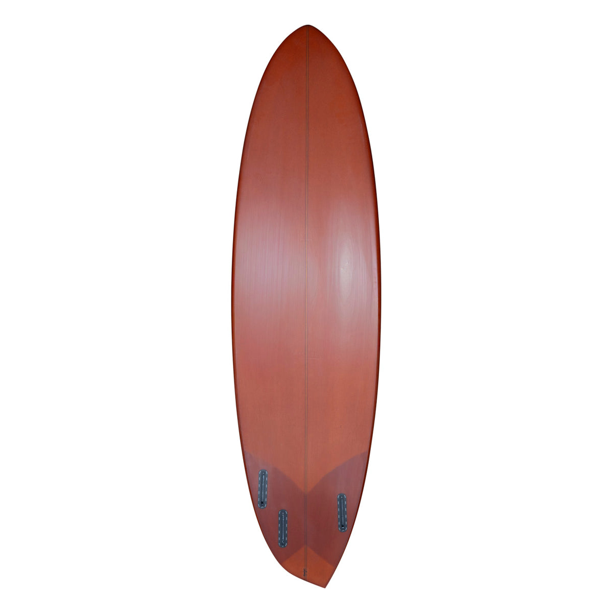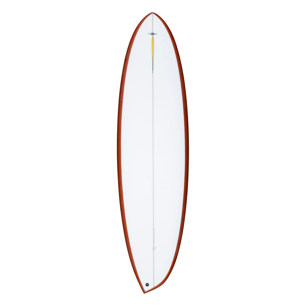 An asymmetrical mid length board with a fuller nose outline and curve throughout. The tail shape is rounded on the shorter heel side and curves to an off set point on the topside rail. Typically made with a bit of volume and a relaxed rocker for good paddling and stability. It can surf like a much shorter board with drive and sensitivity and a tight turning heel side.
